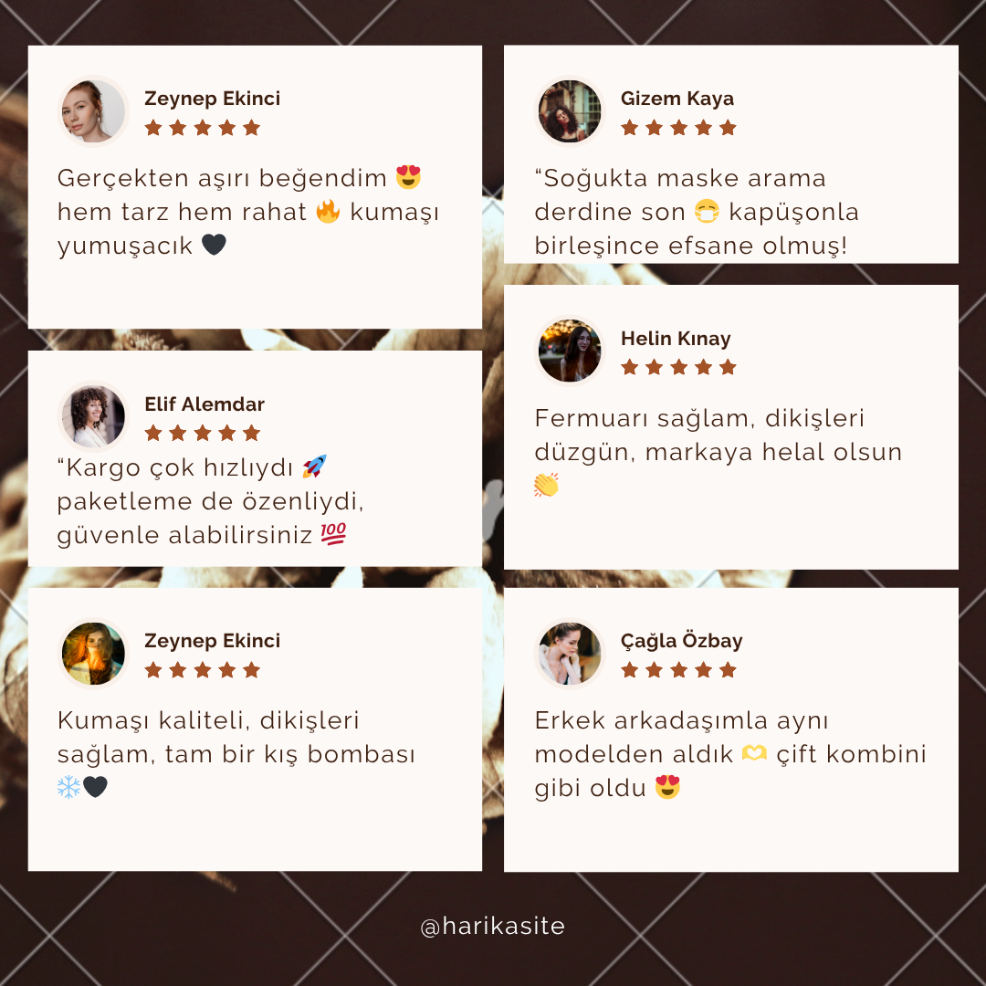 Kumaşını çok sevdim, yumuşacık. Giyince hem rahat hem şık hissediyorsun 🖤. Özellikle kapüşon kısmı ve maskesi tam kış havası için ideal. Kırmızı rengini aldım, tam göründüğü gibi geldi. Kargosu da hızlıydı, gönül rahatlığıyla alınır 💫